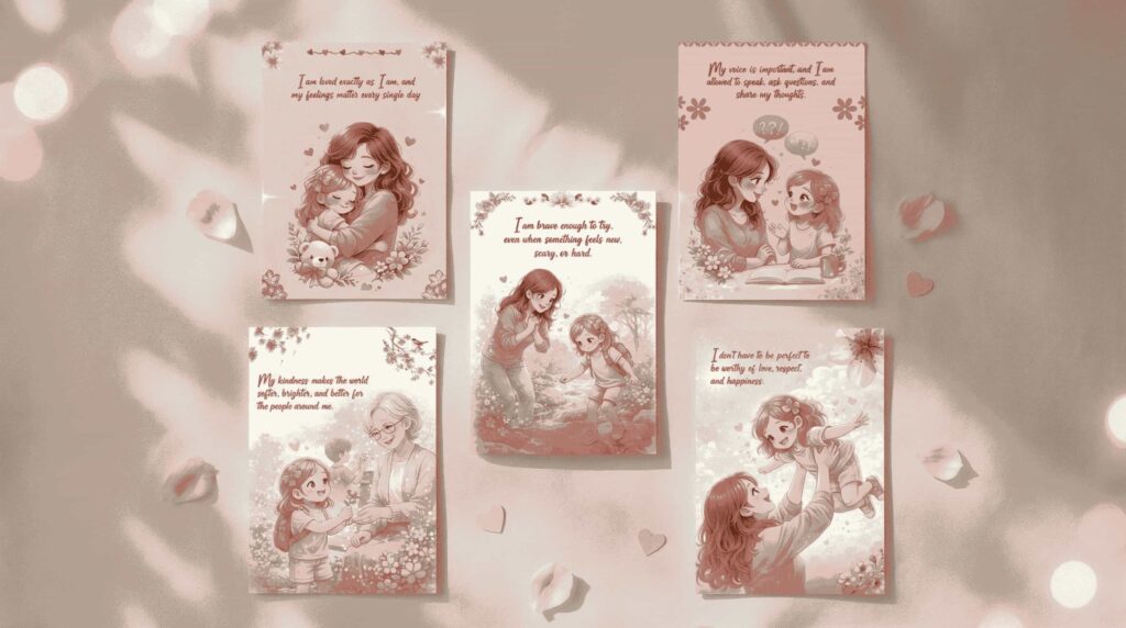 Give your daughter the gift of a positive inner monologue. Our Bloom & Brave Affirmation Deck contains 10 premium, landscape-style cards designed to be read every morning or tucked into a lunchbox. Each card addresses a core pillar of childhood development—from body autonomy and kindness to the courage to make mistakes.
